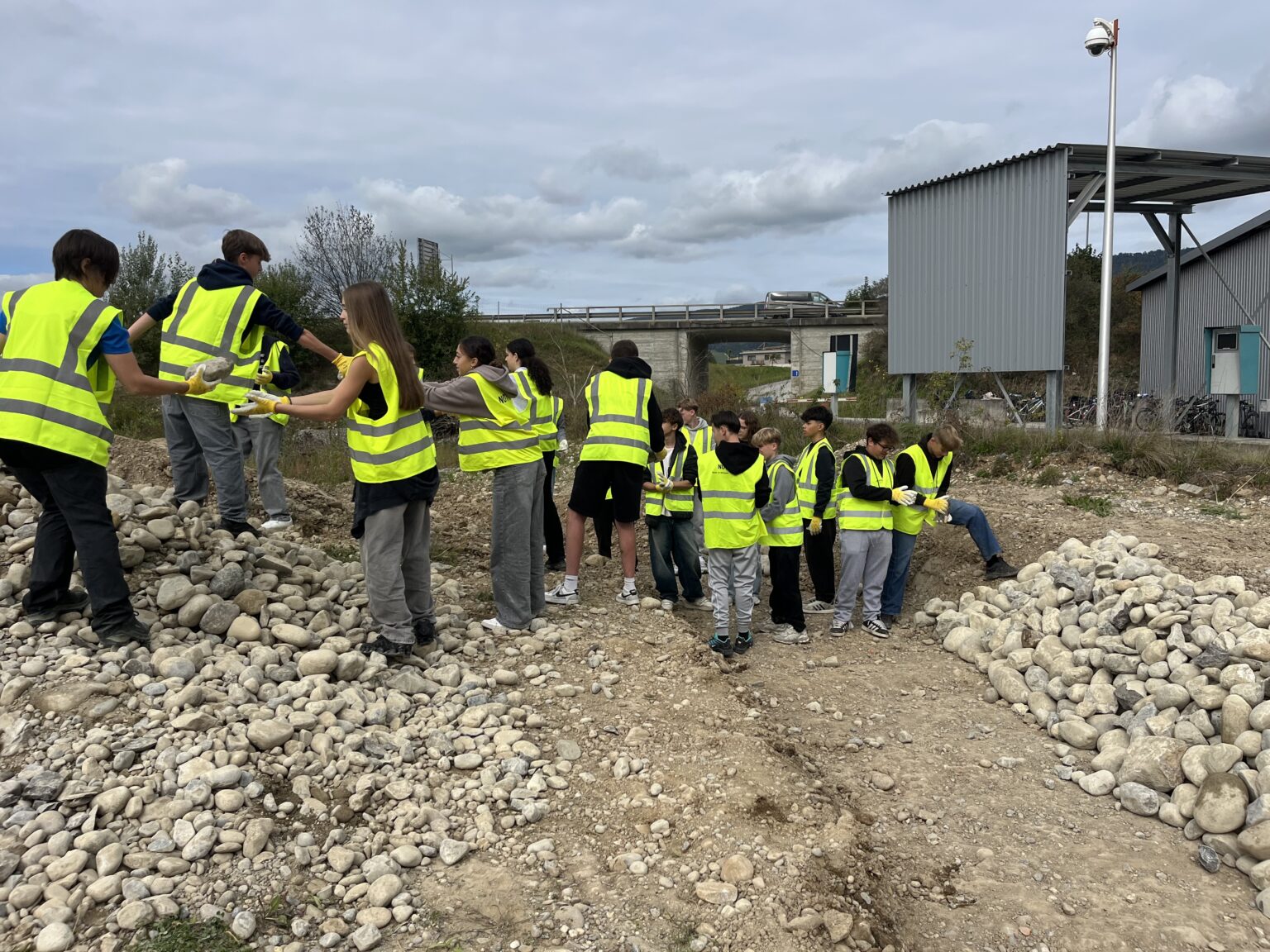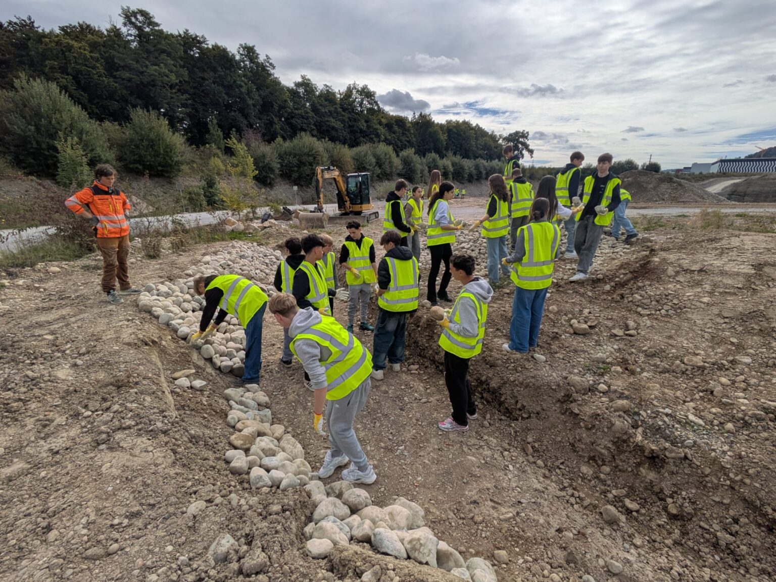 Nach einem Theorieteil leisteten die Schülerinnen und Schülern aus Wohlen und Rupperswil mit dem Bau einer Steinlinse einen praktischen Einsatz unter fachkundiger Anleitung von Vertretenden des Verbands «Baustoff Kreislauf Schweiz» und «Pro Natura».